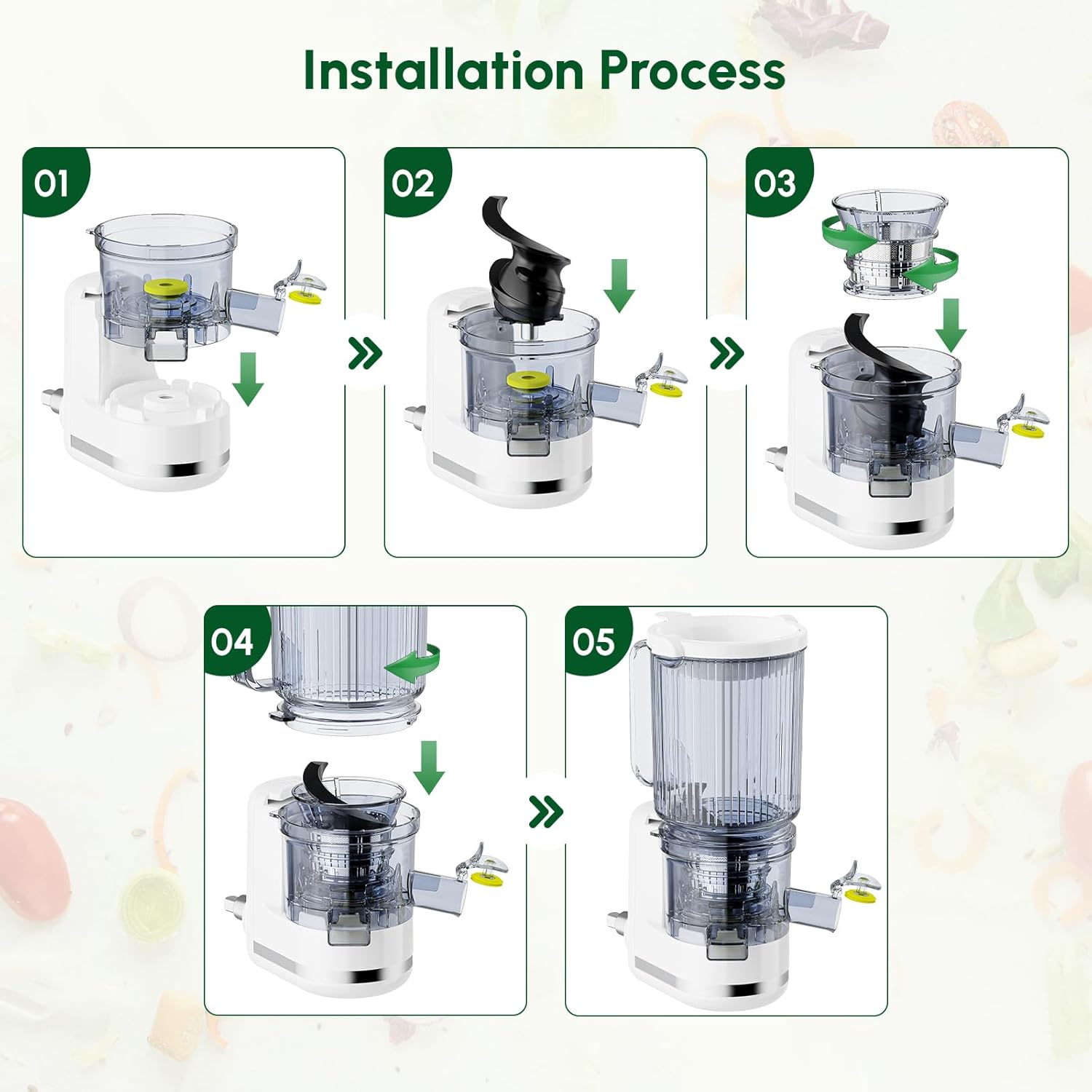 - Assembly & Safety Guidance. When operating the juicer attachment for kitchen aid, snap the top juice cup clockwise into the groove at the top of the base to lock it in place. Always use the included pusher bar—never insert tools like spoons/forks. Contact us for assistance; this product includes a one-year guarantee