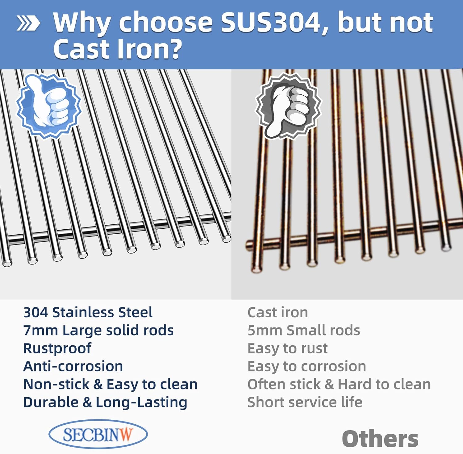 - 【Safe Material & Protect Your Hands】Secbinw grill replacement parts are made of high-quality 100% food grade 304 heavy stainless steel and well-engineered to prevent rust, which is durable with uniform heating and high corrosion resistance, much more heavier and heavy duty. Our cooking grill grate with edge grinding design is free of sharp edges, made with nice welds and smooth surface, no sharp edges and will not hurt your hands. Best choice for your weber genesis ii grills.