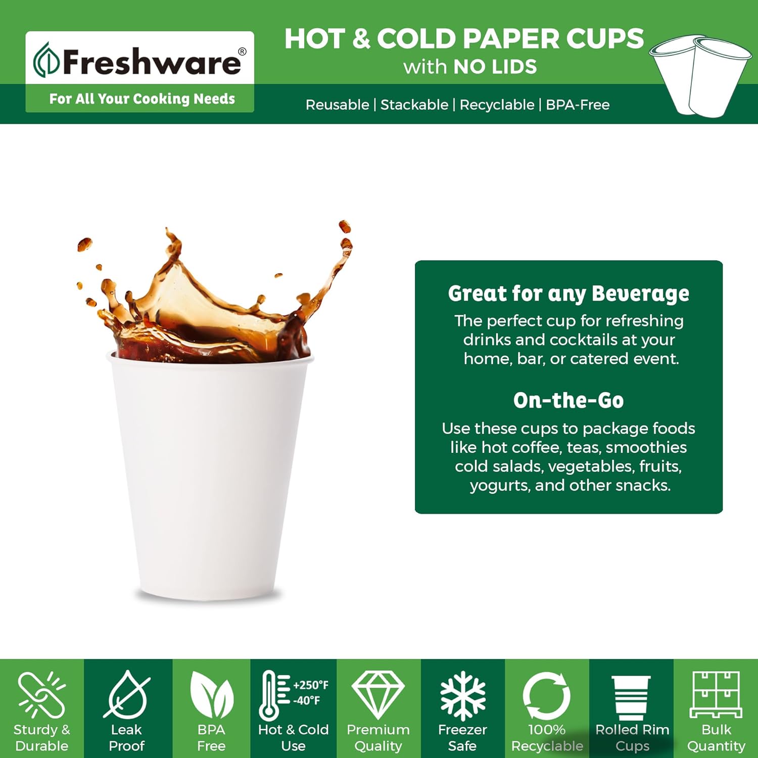Freshware Coffee Cups 8 oz [100 Pack] Disposable Paper Cups for Hot or Iced Coffee Cup, Slushie Cup, Milkshakes, Smoothies, and Tea