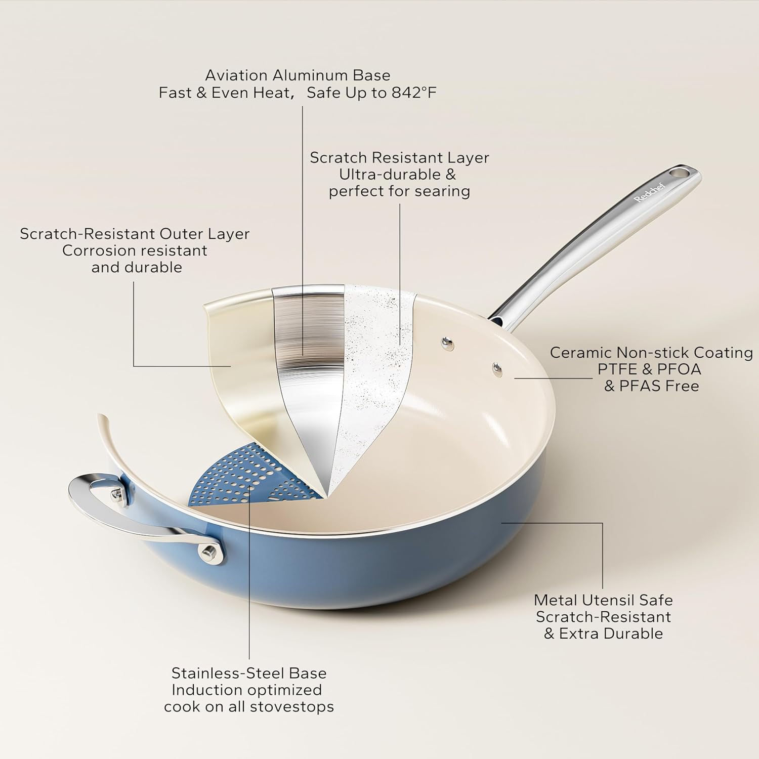 - Healthy Ceramic Coating: Redchef kitchen ceramic cookware set features a natural ceramic coating free from Teflon, PFAS, PTFE, PFOA, lead, and cadmium, ensuring safety and health. You can enjoy your cooking on cookware safely & easily