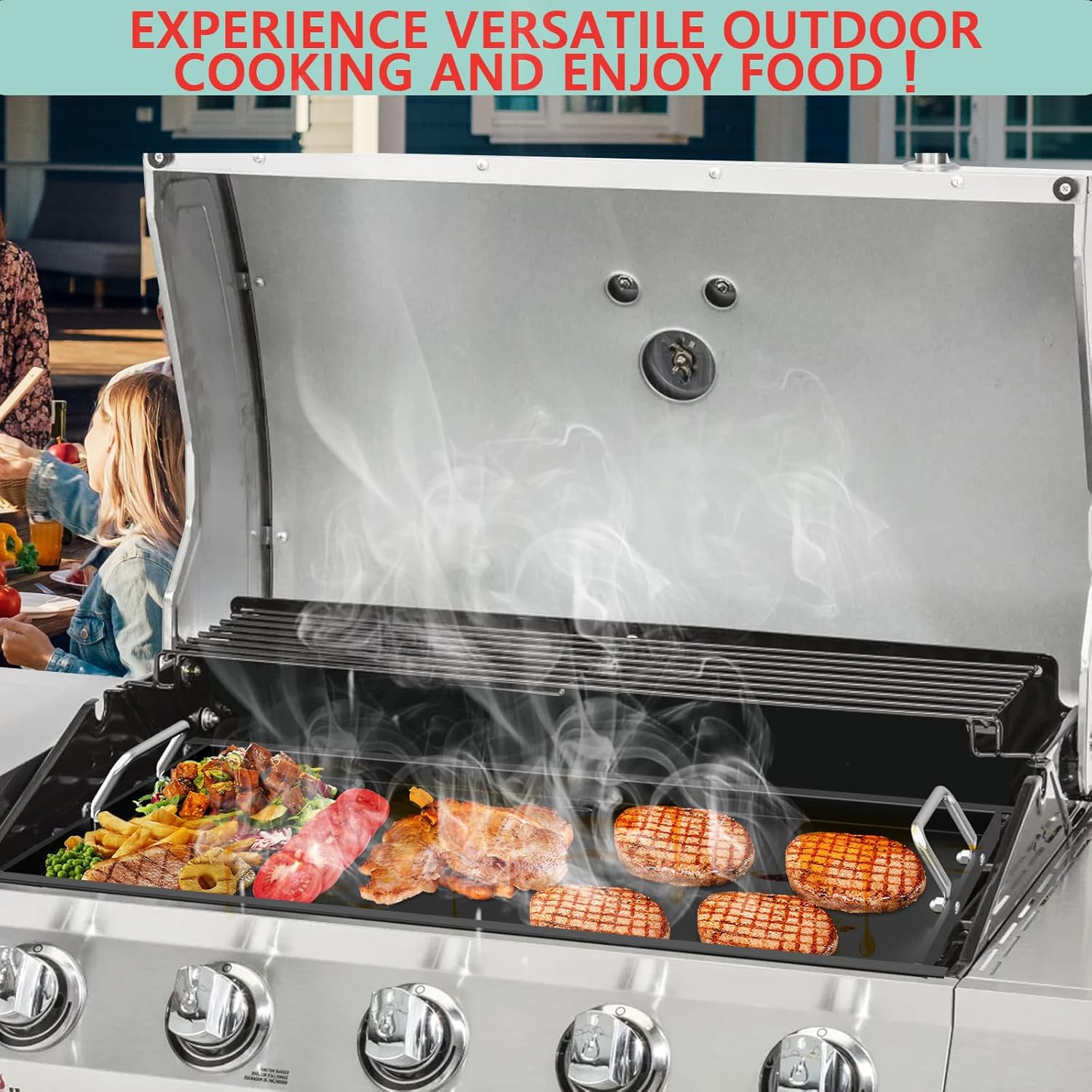 - Versatility: Experience versatile outdoor cooking and enjoy the benefits of a true flat griddle on your outdoor gas grill. A culinary powerhouse that revolutionizes your cooking experience both indoors and outdoors. perfect for sizzling crispy bacon, grilling juicy burgers and savory hot dogs, or even steaming and stir-frying multiple dishes simultaneously—no more waiting around for your meals!