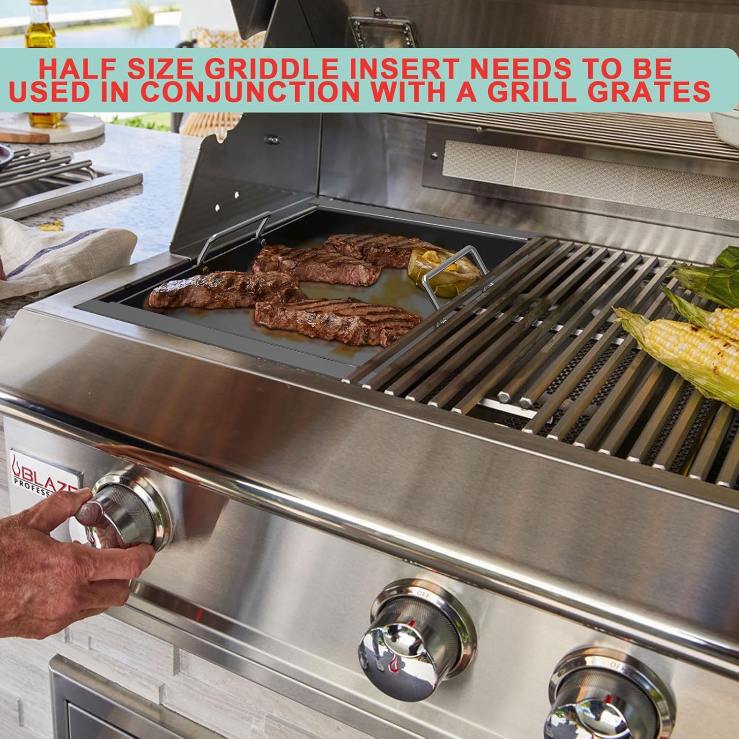 - Versatility: Experience versatile outdoor cooking and enjoy the benefits of a true flat griddle on your outdoor gas grill. Put in our Half size griddle insert, You can also put in 2 pack grill grates in it. Cook in separate areas without cross-mixing flavors and save your cooking time! perfect for sizzling crispy bacon, grilling juicy burgers and savory hot dogs, or even steaming and stir-frying multiple dishes simultaneously—no more waiting around for your meals!