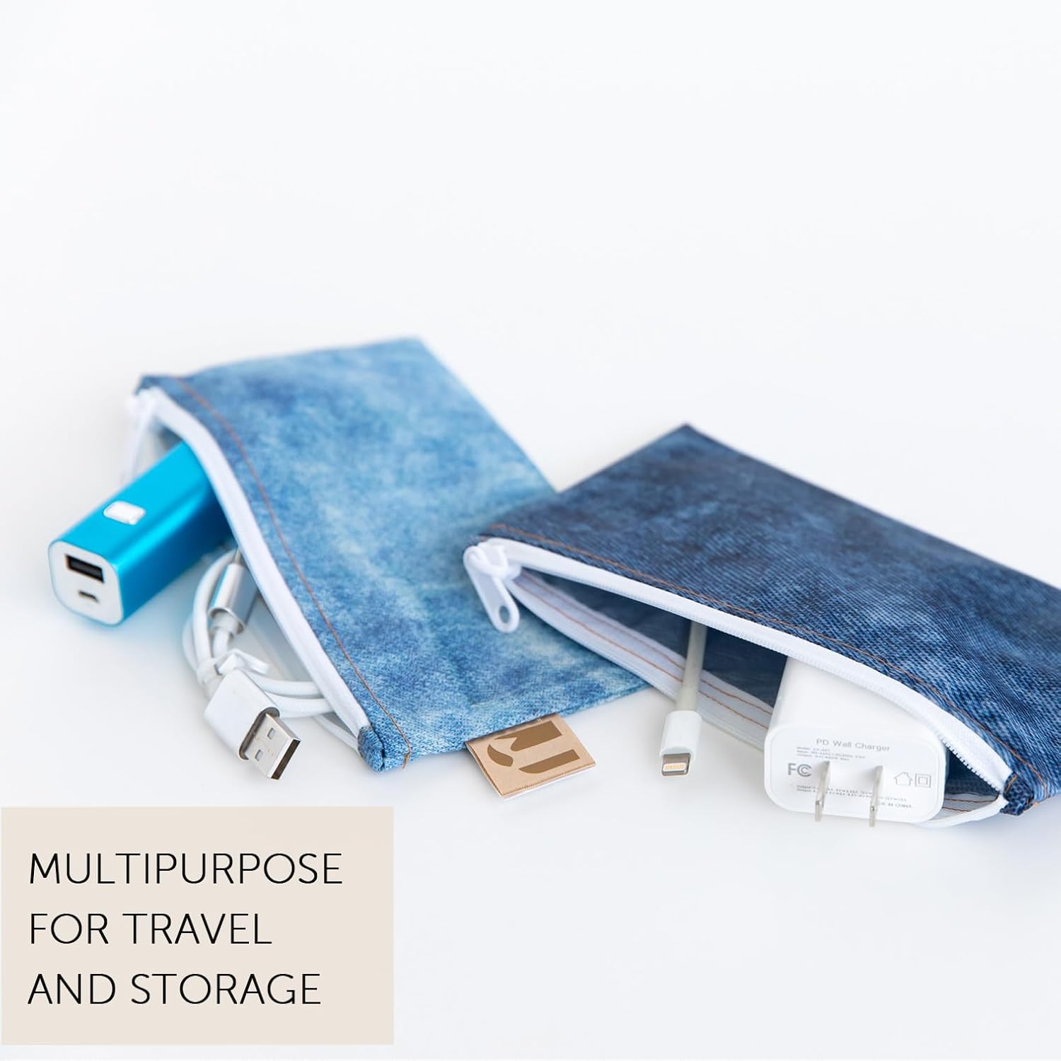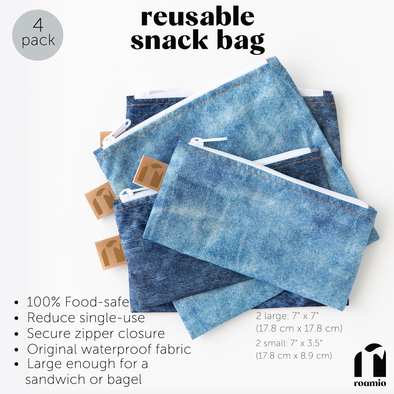 Roamio Reusable Sandwich and Snack Bags, for Kids School Lunch and for Adults Portion, Washable Fabric, Waterproof Cloth Zip Bag, Pack Travel Pouch, Food-Safe Storage, 4-pack Set Faux Denim On Denim