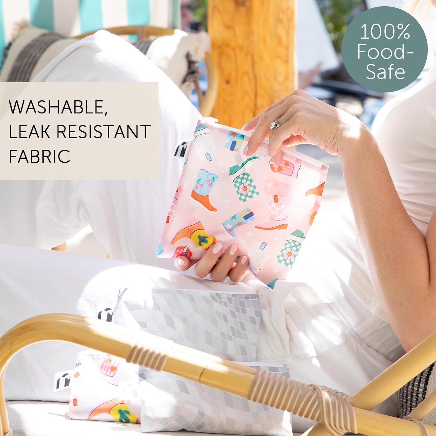 Roamio Reusable Sandwich and Snack Bags, for Kids School Lunch and for Adults Portion, Washable Fabric, Waterproof Cloth Zip Bag, Travel Pouch, Food-Safe Storage, 4-pack Set Cowgirl Boots and Disco