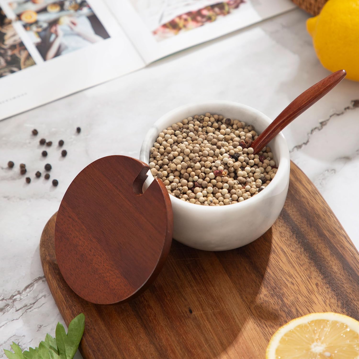 - The salt cellar is made of natural marble by hand grinding, with a polished exterior. Each is unique, and the cover is made of high-quality natural bamboo to keep out dust or bugs.