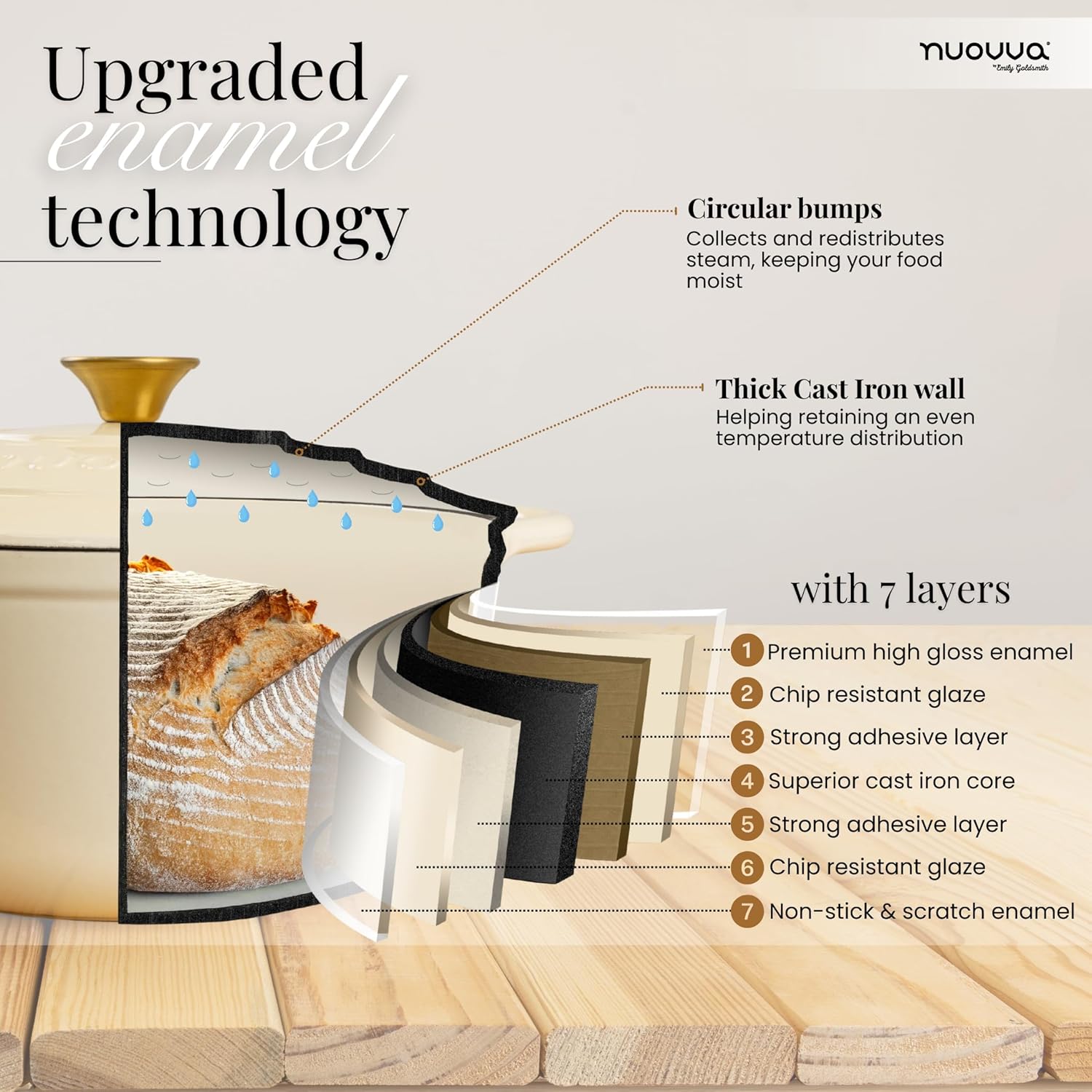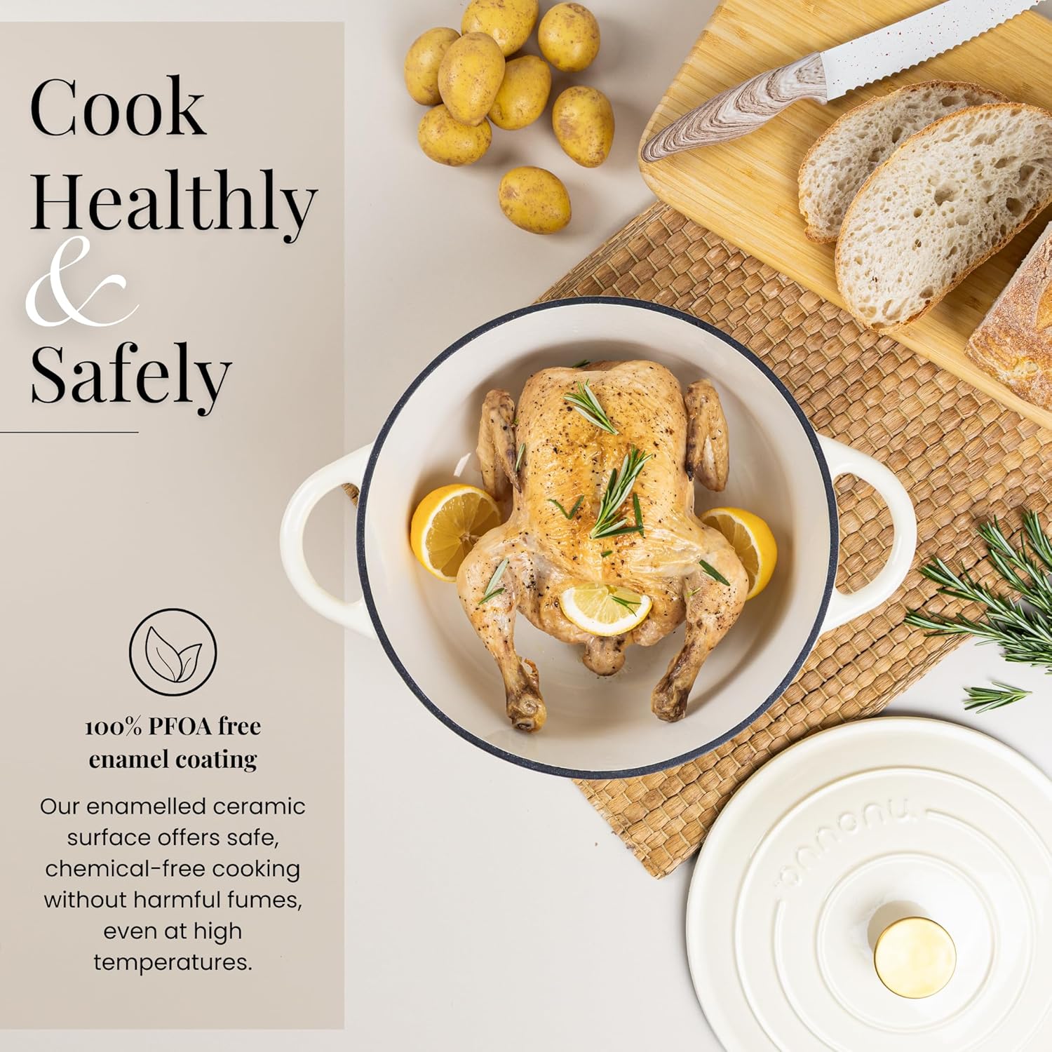 Nuovva Enamelled Cast Iron Dutch Oven Pot with Lid – 6.4 Quart Non Stick Casserole Pot – Heavy Duty & Oven Safe up to 500° F for Bread Baking, Braising, Stews, Roasting – 28cm Cream