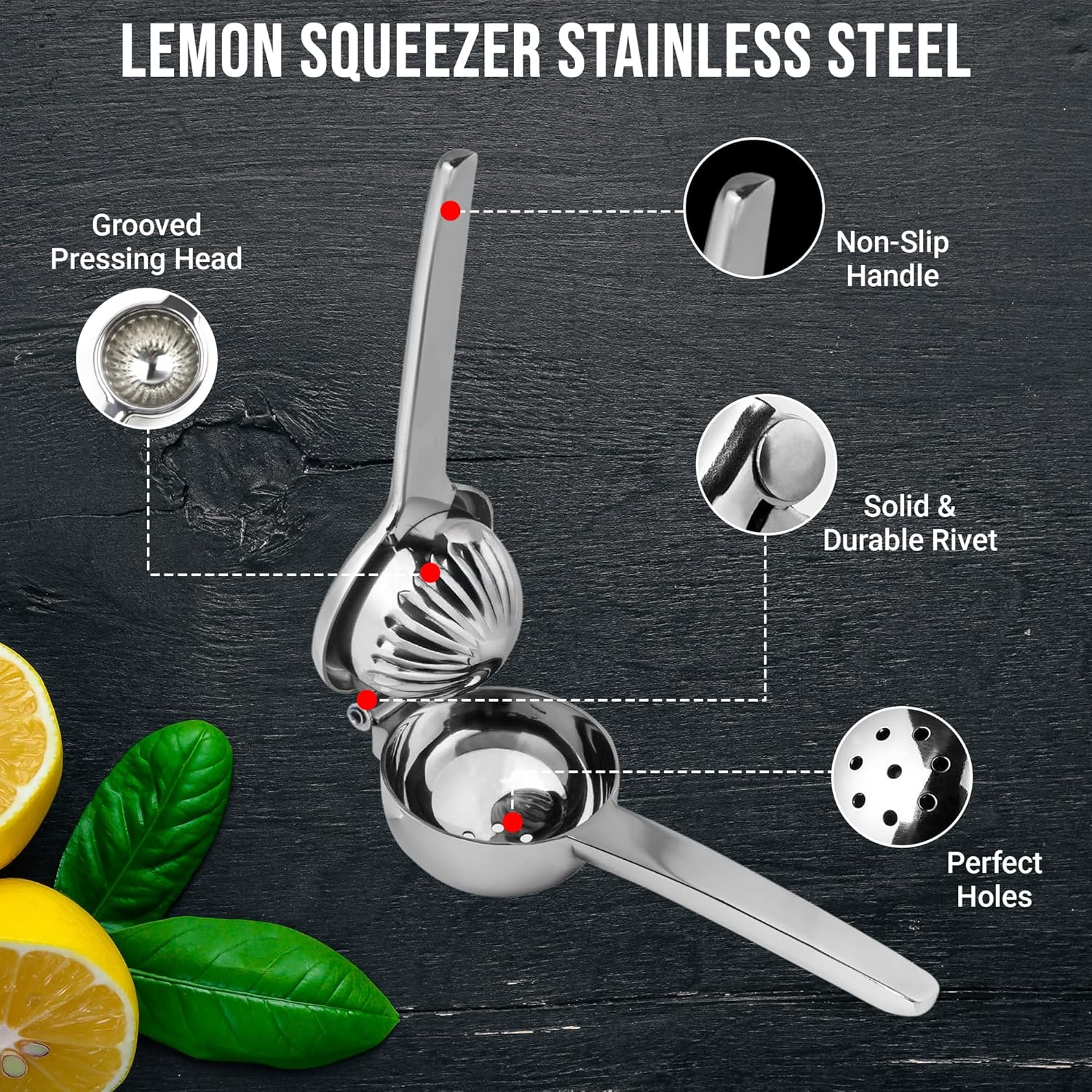 - 💪 ERGONOMIC DESIGN FOR COMFORTABLE USE – Designed with comfortable, easy-grip handles, this lemon and lime squeezer gives you solid leverage without straining your wrists. Whether you're using it as a manual lemon squeezers for cocktails or a juice squeezer handheld for cooking, you'll enjoy effortless control and efficient juice flow every time. Stainless steel juicer hand press, citrus squeezer hand press