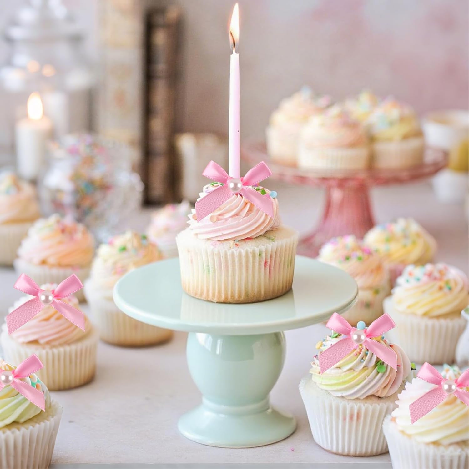 - 【High Quality Material】: These pearl bow cupcake decorations are made of quality satin fabric and comes with attachable clear plastic spikes; not easy to break, smooth, and shiny, offering a comfortable touch; Their cute and fun bow pattern which add charm and whimsy to your desserts, making your birthday party even more memorable.