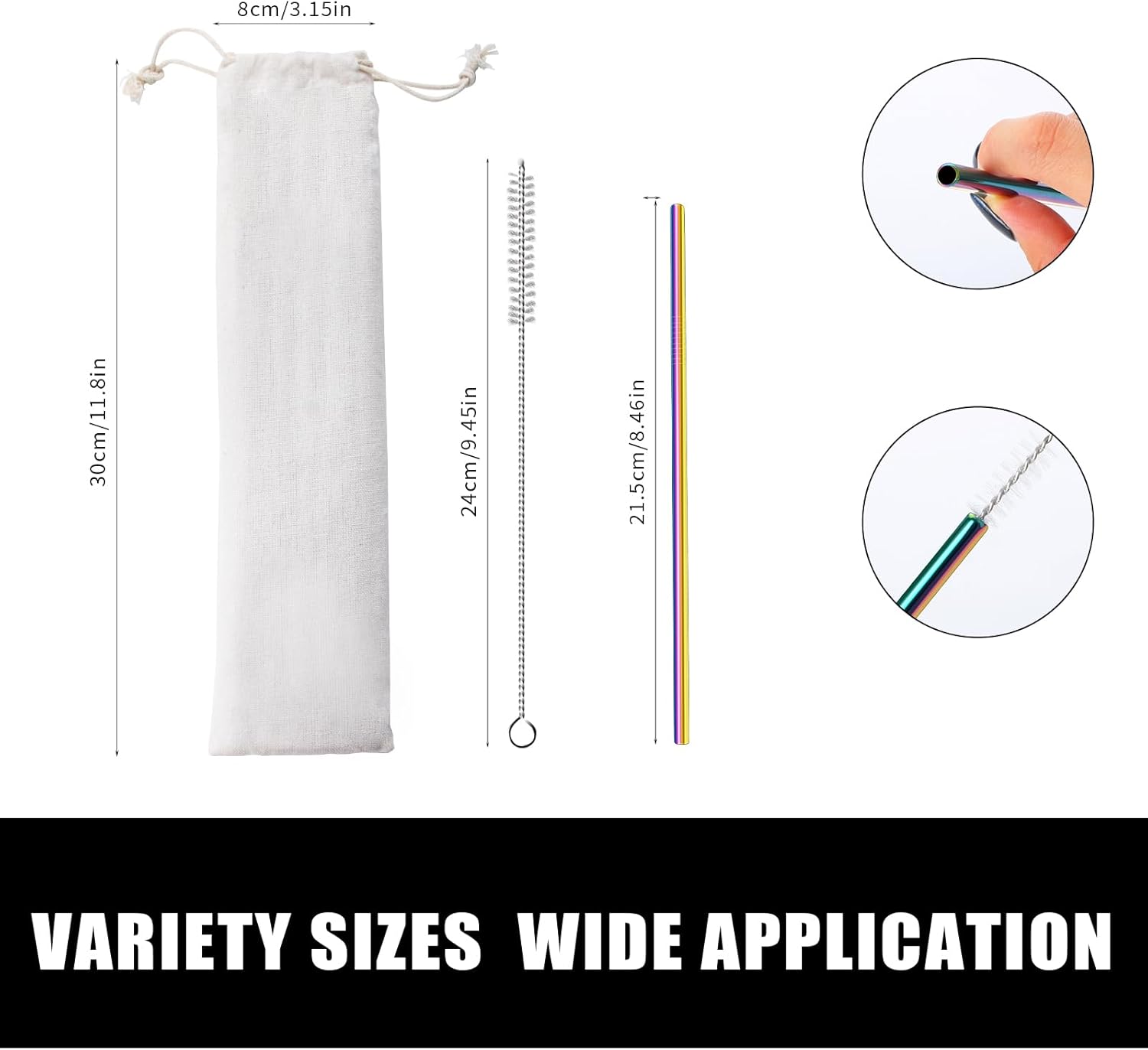 - 【RAINBOW STRAWS REUSABLE SET, GREAT VALUE】Includes 10 pcs 8.5" straight straws, 4 pcs straw brush and a travel bag. Colorful titanium reuseable straws, variety sizes and shapes - perfect steel straws set for kitchen, bar and picnic.