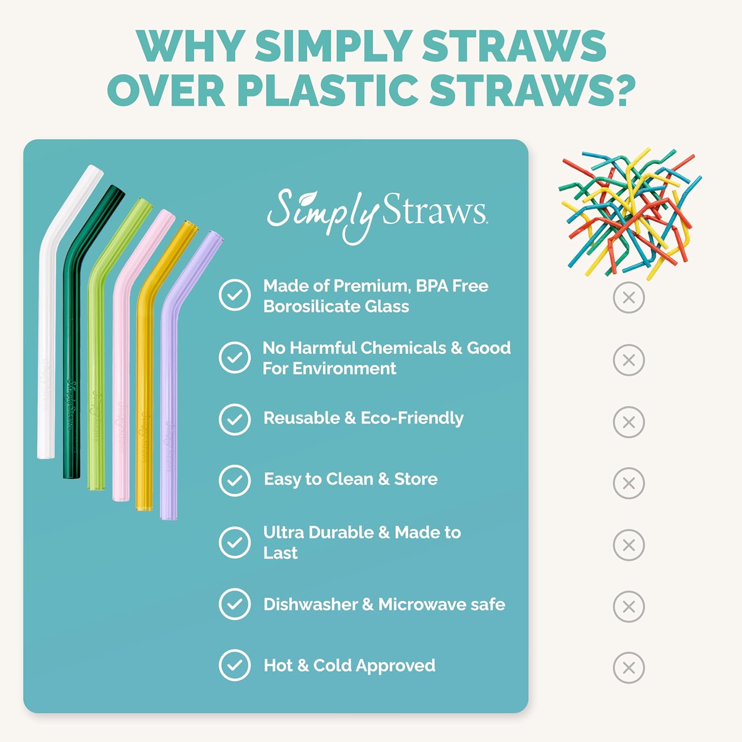 Simply Straws 6 Inch Glass Straws Bent (6-Pack) – Reusable Glass Straws for Low Balls & Stemless Glasses, with Cleaning Brush – Dishwasher Safe, Hot & Cold Use, BPA-Free (Meadow)