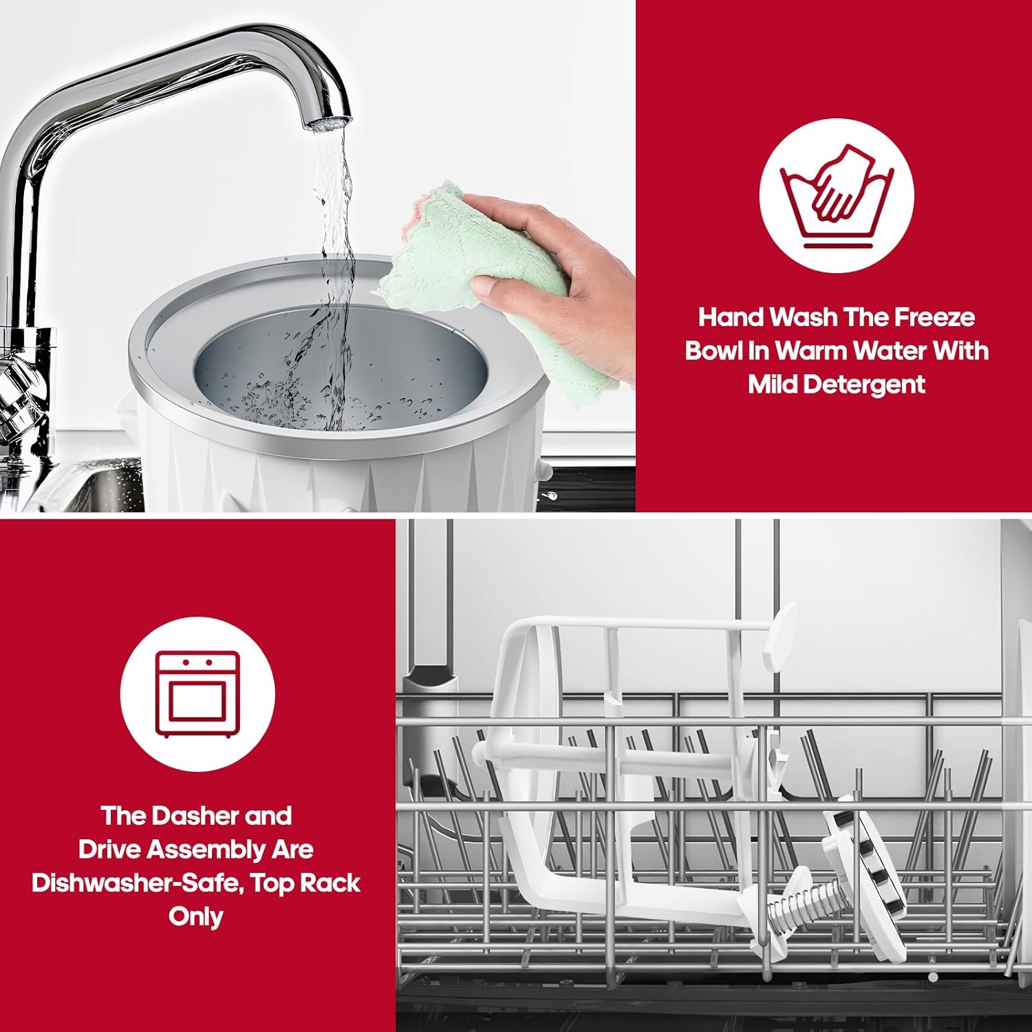 - Easy to Clean: Once the ice cram bowl kitchenaid mixer attachments has reached room temperature, simply clean with warm, soapy water. Please Note: Never immerse the kitchenaid ice cream maker attachment in water or other liquid, also never wash in dishwasher. The Dasher and Drive Assembly are Dishwasher-safe. (Freezer bowl must be thoroughly dried before placing it in the freezer or storing it, to preserve performance)