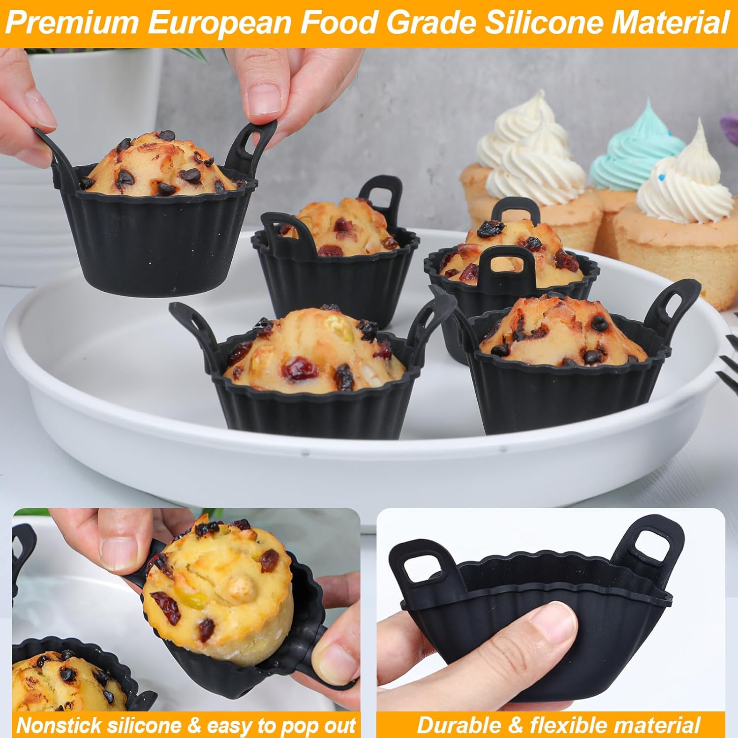 - 【Non-stick Baking Cup Set】 Nonstick silicone and the cupcake will pop out when you press it around after baking, easy to take out. Easy to clean by hand and dishwasher friendly. They can be reused to keep long times using, which is more economical compared to paper cups