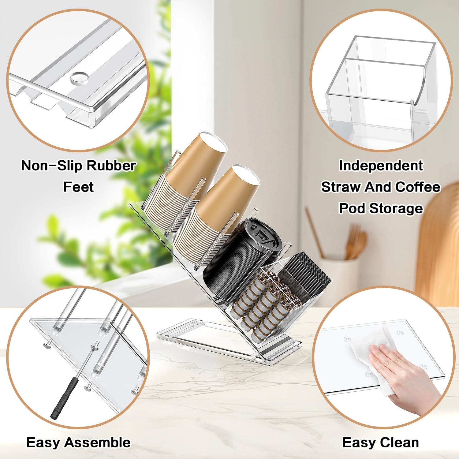 - 【Space-Saving & Organized Design】Maximize your counter space with this sleek acrylic coffee caddy. Equipped with 3 compartments for cups and lids plus a built-in basket for coffee pods, straws, or stirrers, it neatly organizes disposable cups, lids, and coffee essentials. Keep your kitchen, coffee bar, or café clutter-free and professional.