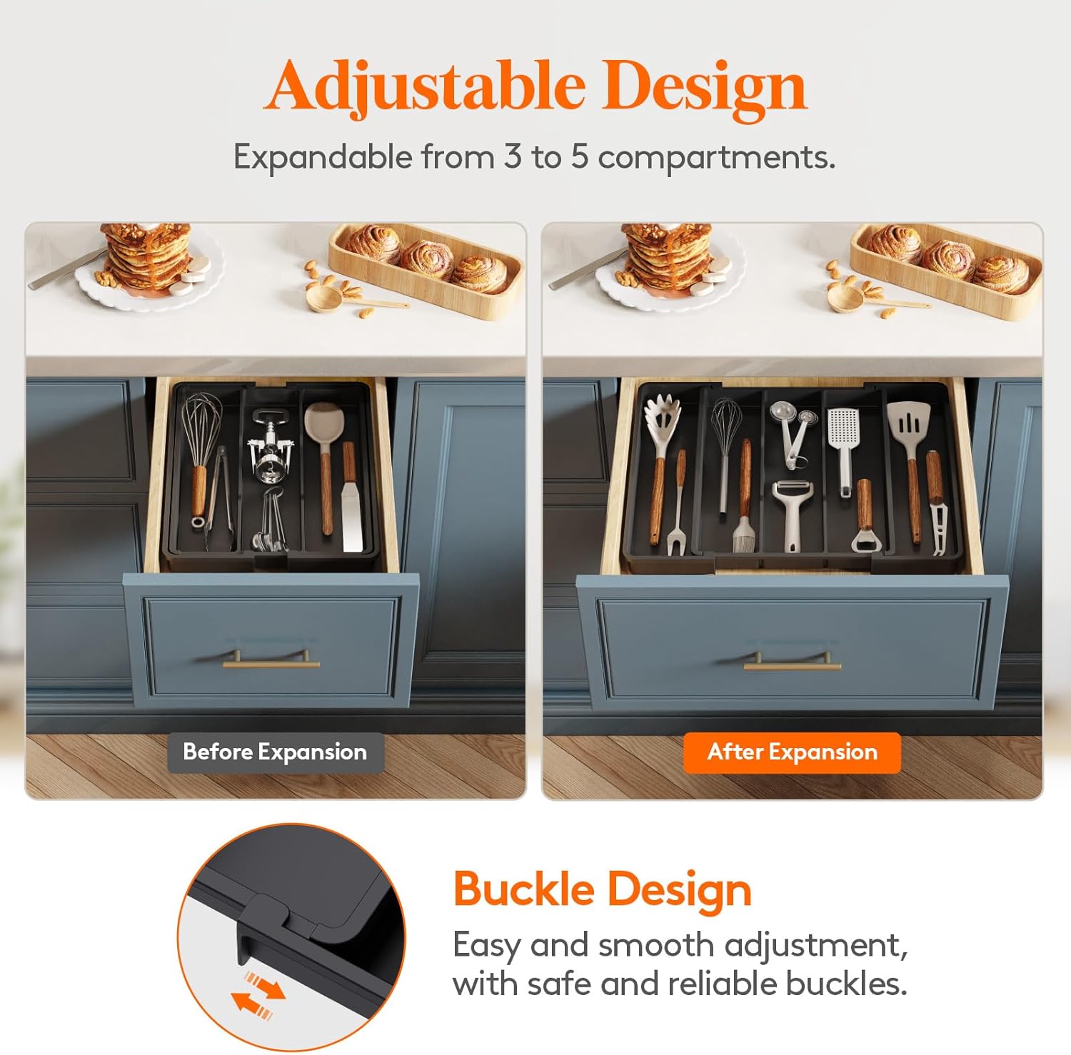 - Thoughtful Design: Unique groove design for easy access to cutlery; The buckle design ensures smooth sliding and effortless adjustment, preventing partition displacement. Lifewit utensil holders bring seamless order to your kitchen!