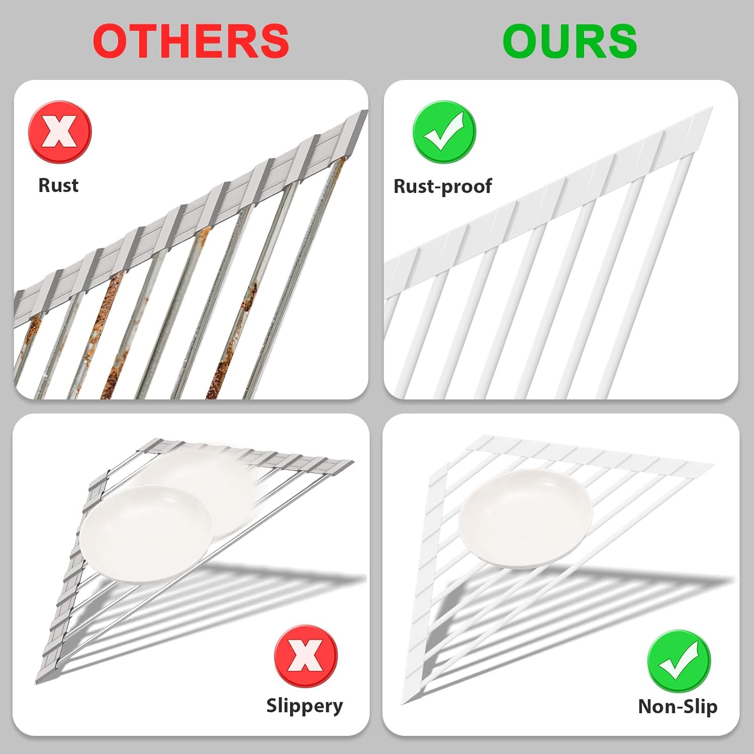 - ✔️【Upgraded Reinforced Triangle Design, Solid and Durable】Using elongated silicone edges and stainless steel tubes double reinforced to ensure that the dish draining rack is not easy to fall off and deform.304 stainless steel skeleton to support heavy objects without deformation, one-piece molding non-slip silicone coating rust-resistant and durable, specially designed for frequent use to enhance the life of the draining rack.