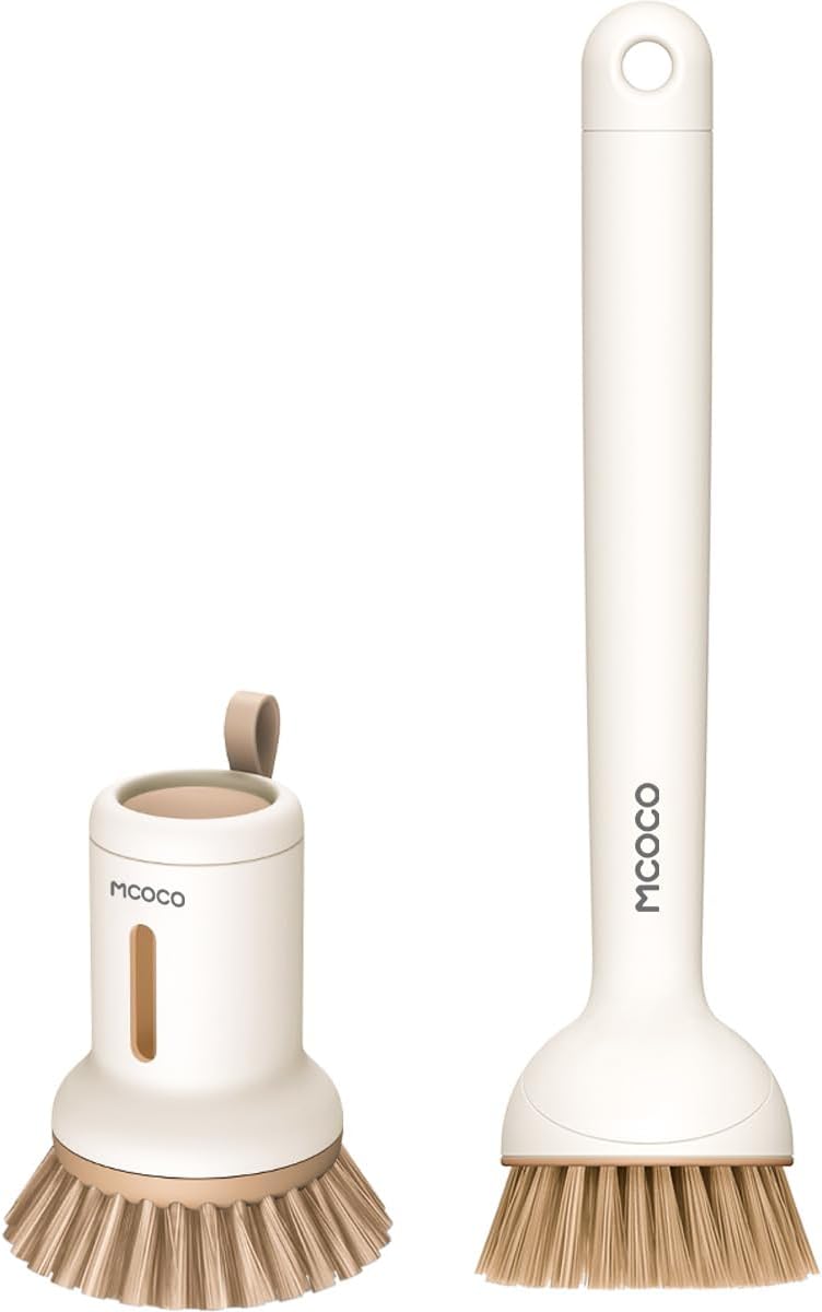 - Safe and Durable Construction: Made from high quality material, MCOCO Dish Brush Set with Soap Dispensing Palm Brush are built to last; The tough yet gentle bristles effectively remove stubborn residue without scratching delicate surfaces, ensuring your cookware stays protected through daily use
