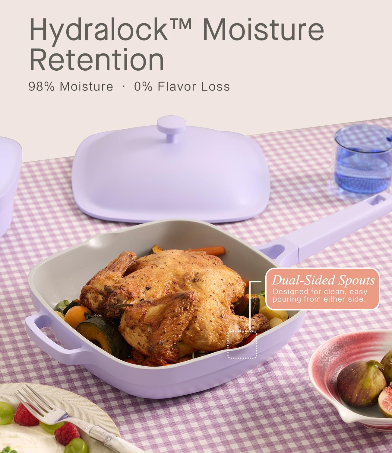 - Thoughtfully Designed for Flavor & Function:The elevated lid creates extra space inside the pan, guiding condensation down the sides to lock in moisture and intensify flavor. Dual pour spouts make draining, pouring, and cleaning effortless — perfect for juicy, tender results with less mess.