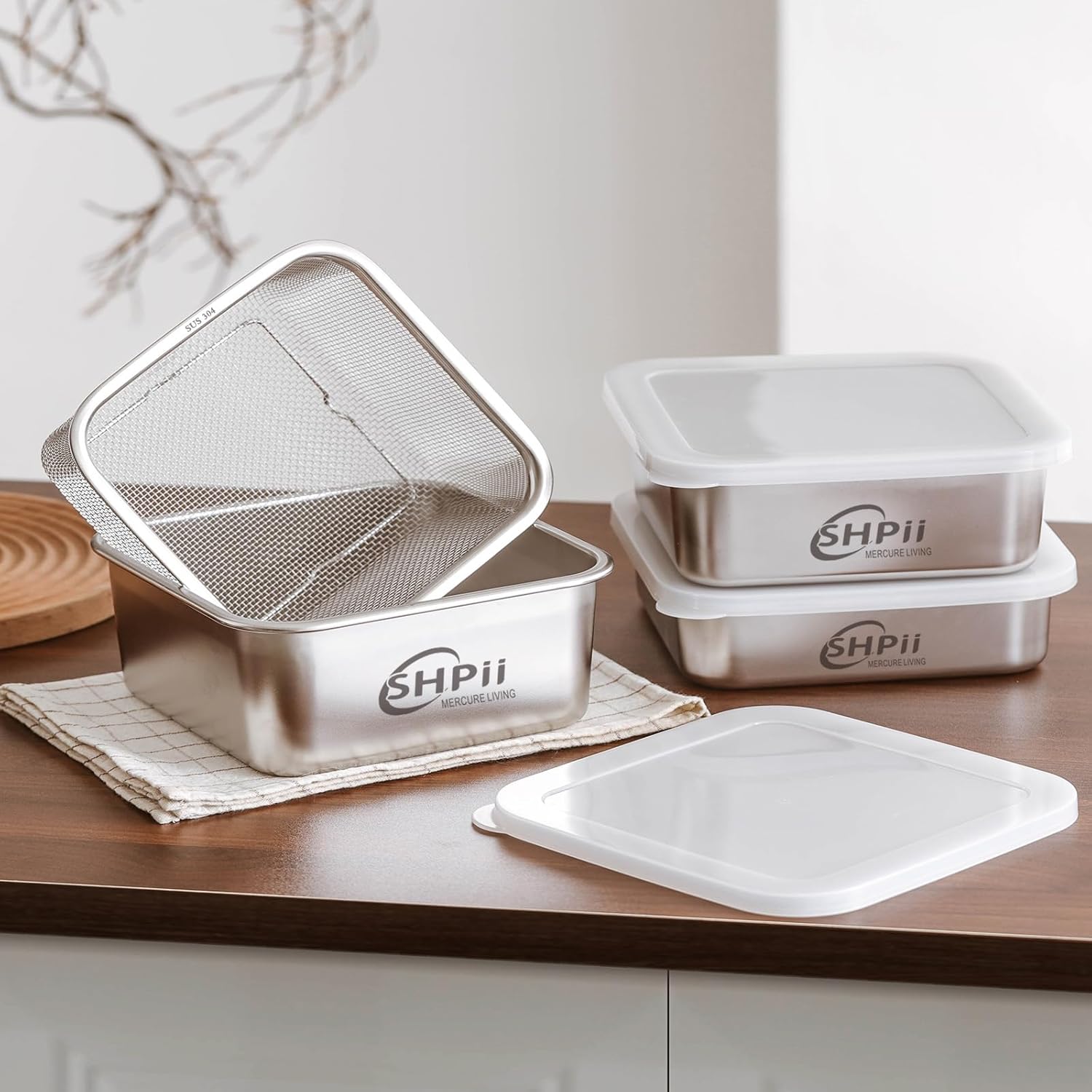 Square Colander Set, 304 stainless steel, with PE lid, deli containers, back of the kitchen preparation, washing and draining tools, refrigerator storage, frying oil filter (2500ML)