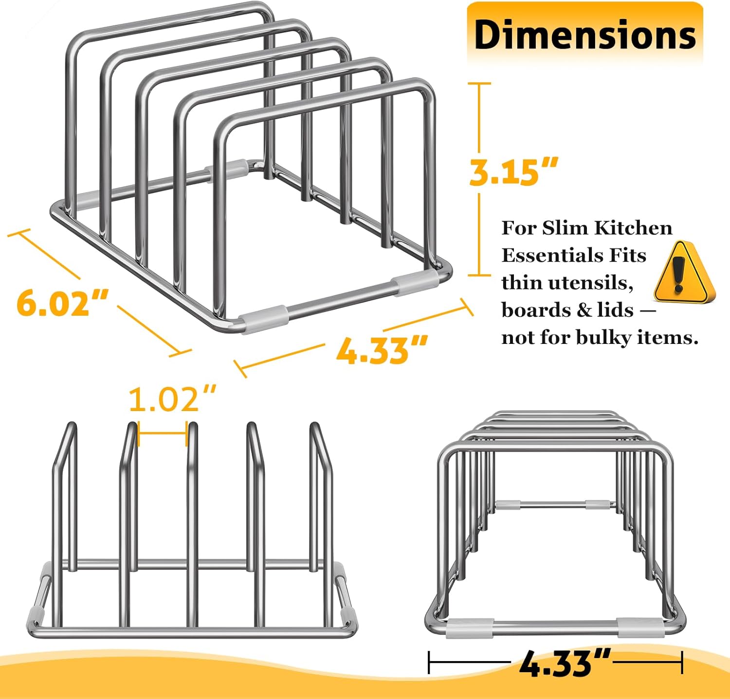 - πππππ-ππππππ πππππππ πππππππππ: Ultra-slim cutting board organizer measures just 6.02 x 4.33 x 3.15 inches, perfect for countertop or cabinet storage, keeping your kitchen clutter-free and maximizing valuable space for cutting boards, bakeware, and more.