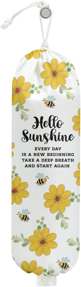 Rustic Floral Cute Bee Plastic Bag Holder for Kitchen Essentials, Wall Mount Grocery Bag Holder for Plastic Bags, Hello Sunshine Reusable Grocery Bags Storage Dispenser for Home Kitchen Farmhouse