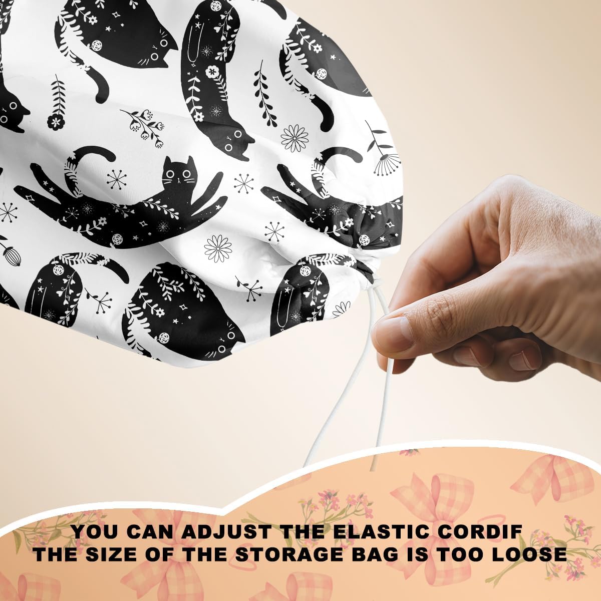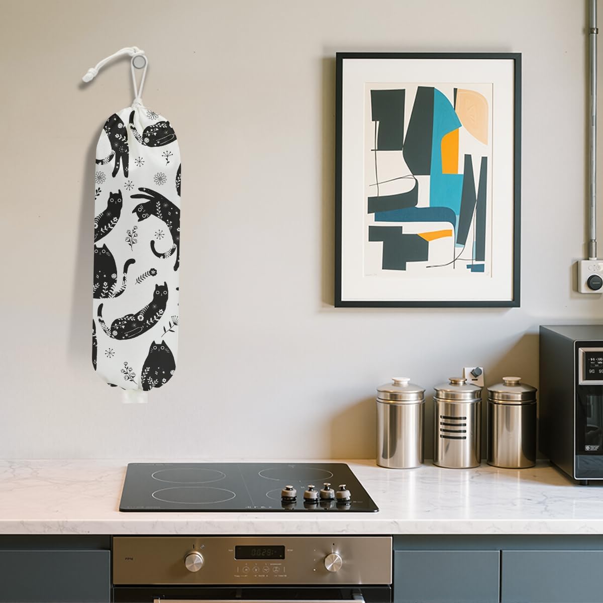 Black White Floral Cat Plastic Bag Holder, Wall Mount Grocery Bag Holder for Plastic Bags, Vibrant Cats Reusable Grocery Bags Storage Dispenser for Home Kitchen Decor, Cat Lover Gifts for Women