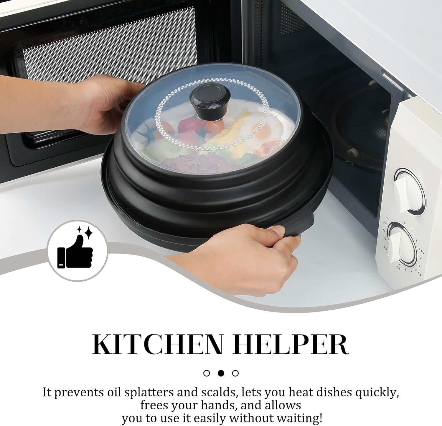 - 【SAFETY DESIGN】:The splatter cover handle provides heat insulation to prevent scalds.With smooth,burr-free edges,its high-temperature-resistant material is suitable for microwave use,avoiding direct hand contact with heat sources for safe operation