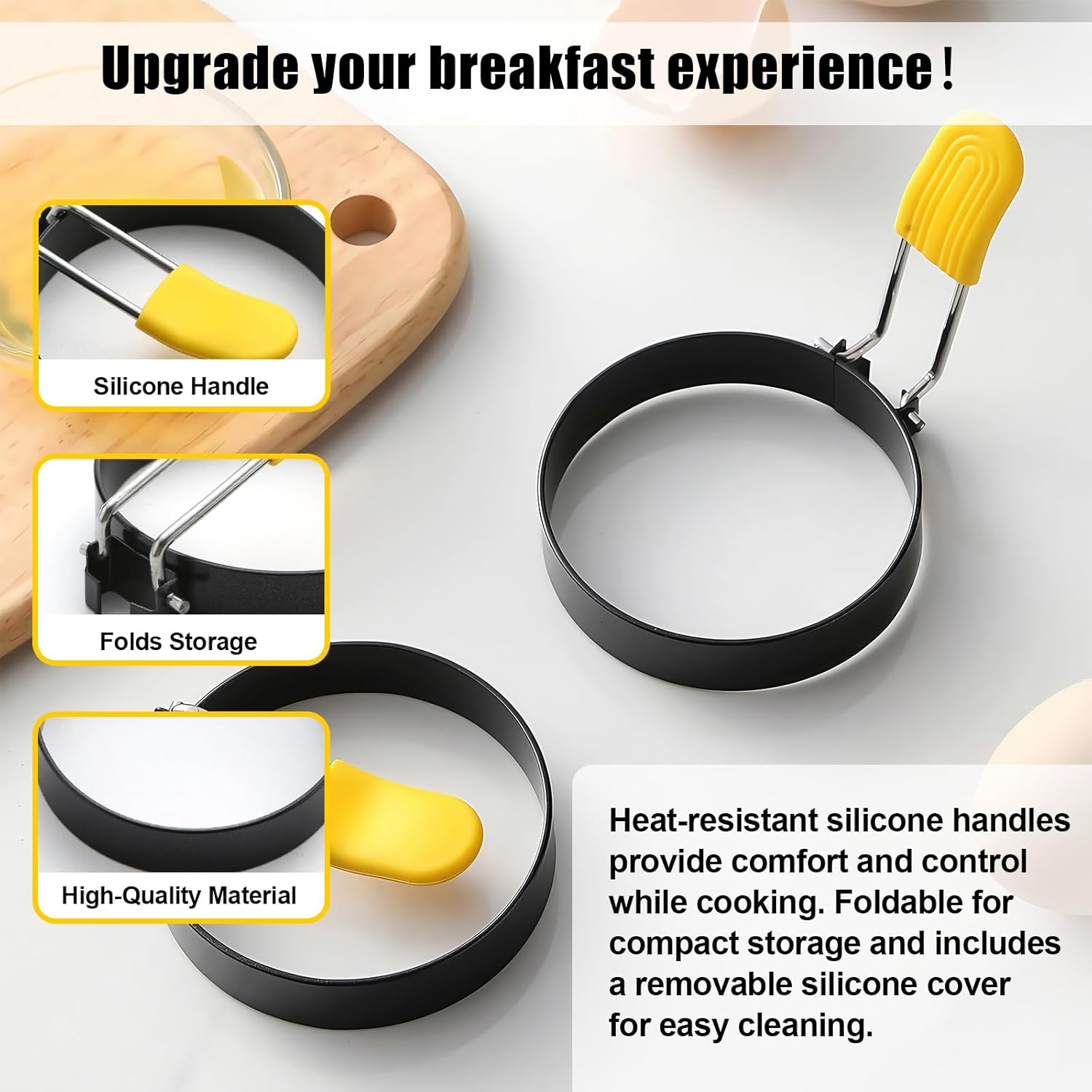 4 Pack Fried Egg Molds Round Stainless Steel Fried Egg Ring with Silicone Handle Perfect for Making Breakfast Sandwiches, Burgers, Pancakes Suitable for Home or Breakfast Carts (3 inch)