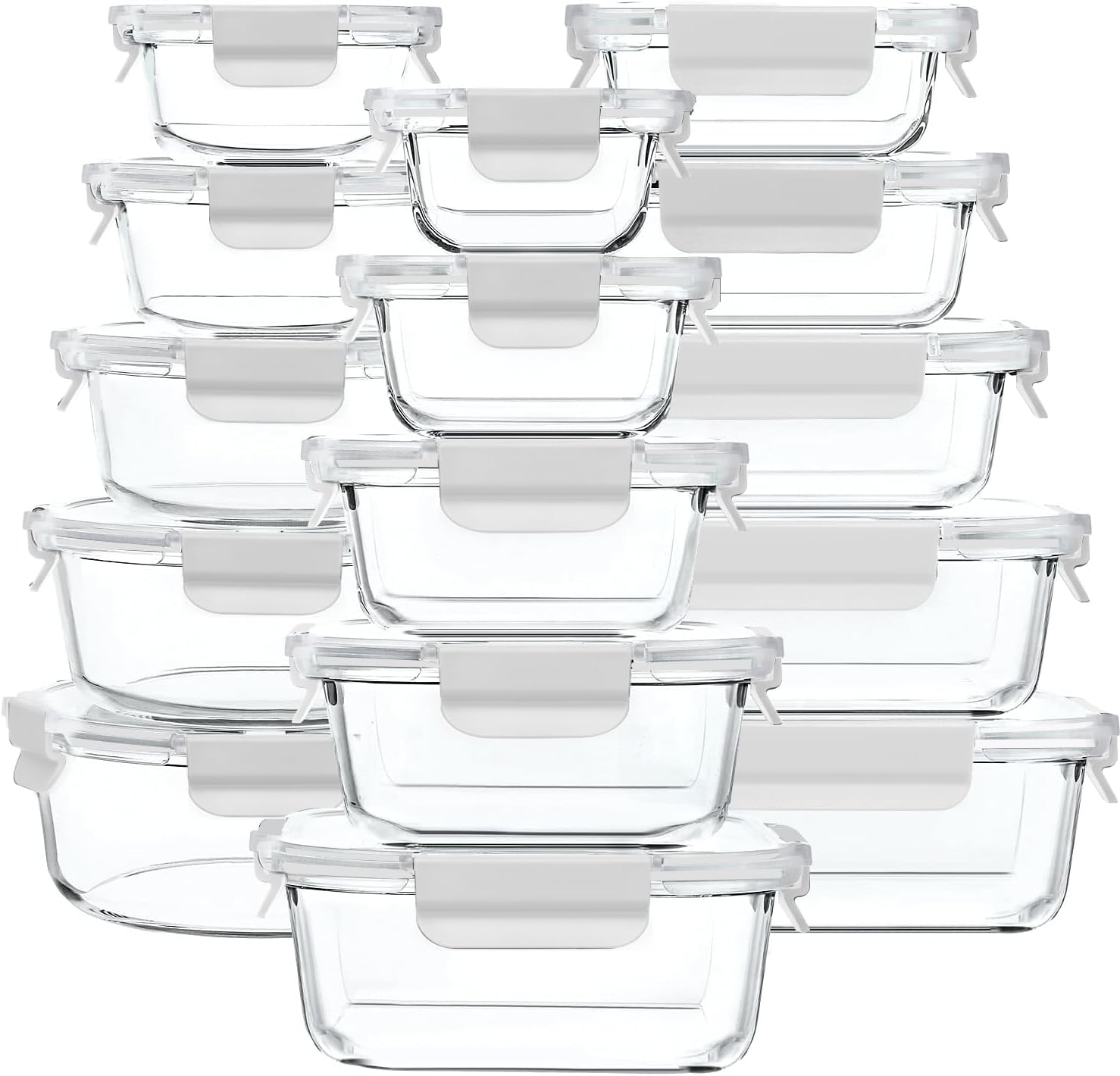 - FOOD CONTAINER SET: This set includes 15-piece glass containers and 15-piece plastic lids in multiple sizes and shapes to fulfill your food storage requirement. Capacity includes: 1(5.0oz),1(6.0oz),1(7.1oz),1(10.8oz),1(12.5 oz),1(13.5oz), 1(17.5oz),1(21.6oz),1(27oz),1(27.9oz),1(32.1oz),1(35.5oz), 1(37.1oz),1(43.9oz),1(51.4oz), container with lids. Keep your refrigerator staying organized.