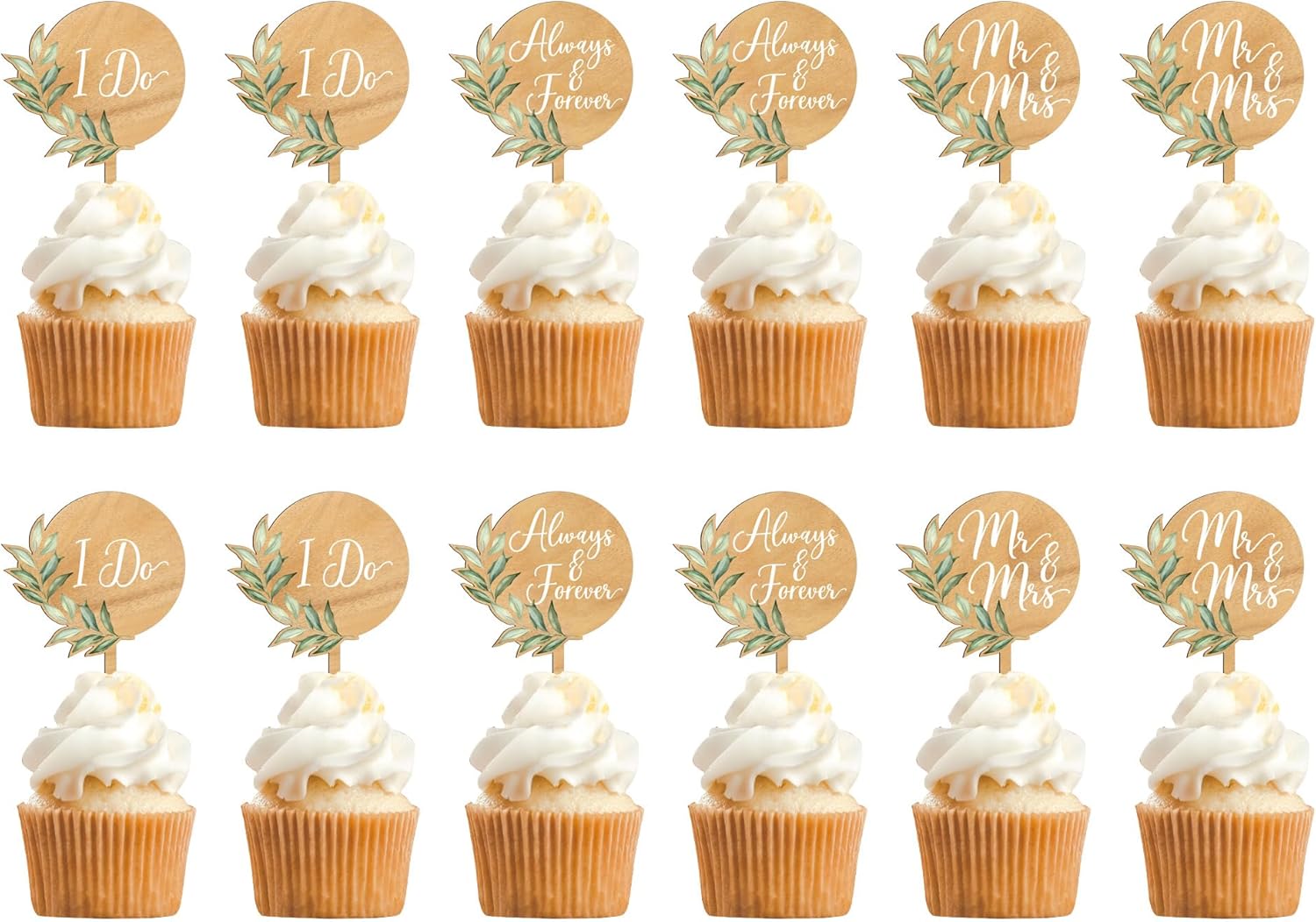12 PCS Greeny Wedding Cupcake Toppers in Wood Mr & Mrs Engagement Cupcake Decorations