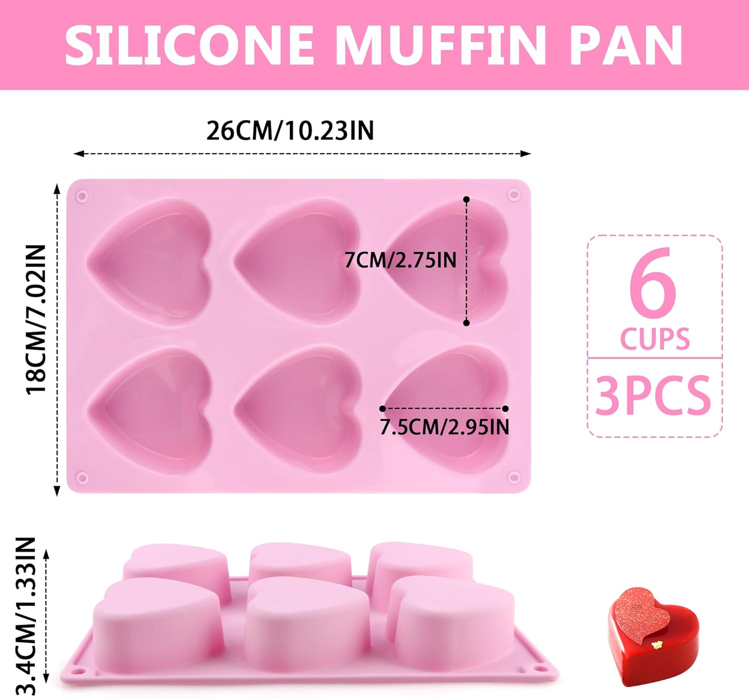 3-Pack 6-Cup Silicone Muffin Pans, Nonstick Cupcake Baking Molds, BPA/PFA-Free, Dishwasher & Oven Safe Heart-shaped Pink