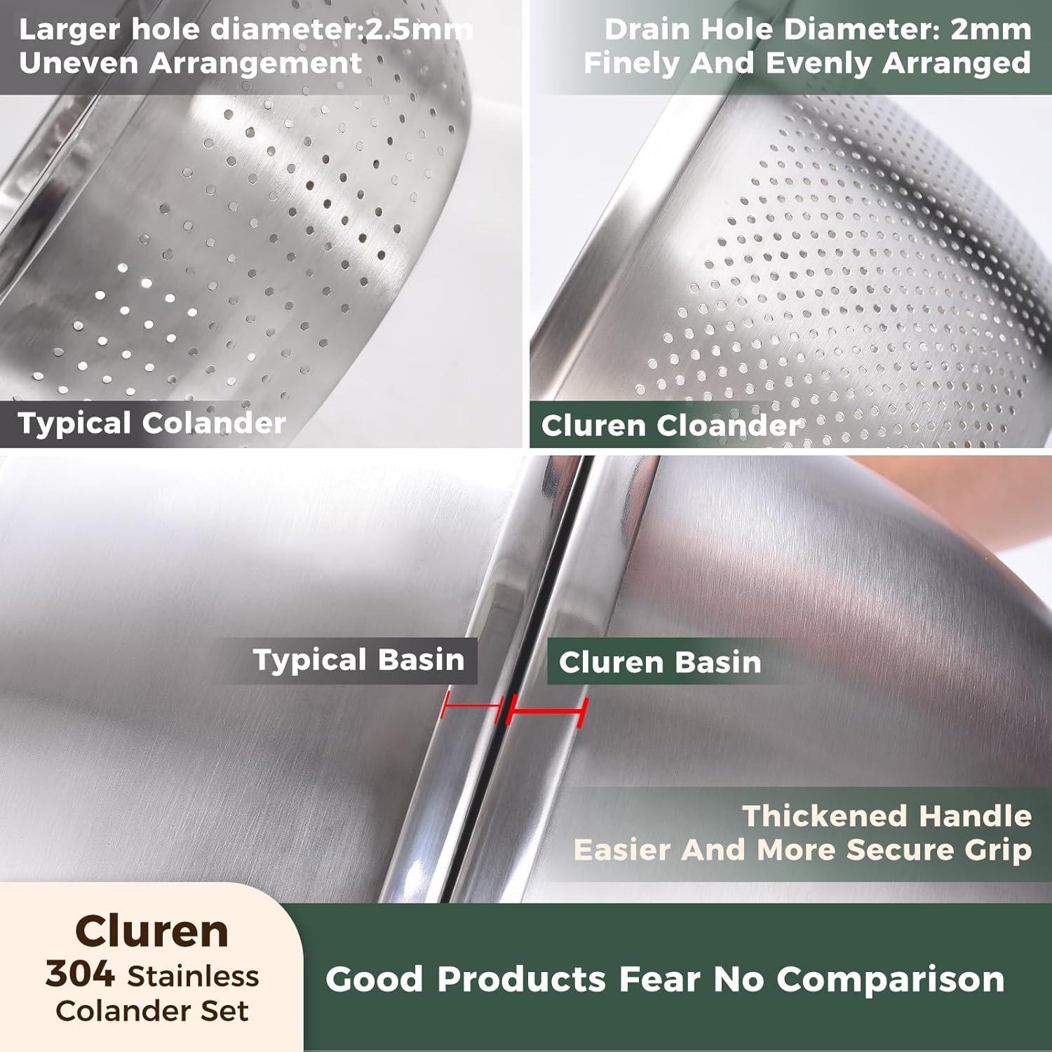 - 💡【Superior Drainage with 2mm Fine Holes】Our colander features 2mm tightly spaced drain holes, smaller than many typical product's 2.5mm holes. This making it the perfect rice strainer and pasta strainer for all your cooking needs.