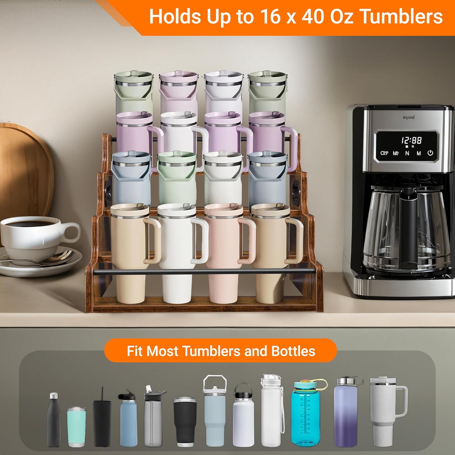 - VERSATILE MULTI-PURPOSE ORGANIZER: This isn't just a liquor shelf. Its versatility makes it the perfect bar shelf for organizing coffee syrups, spices, condiments, cosmetics, or collectibles. Elevate your kitchen counter, coffee nook, or bathroom vanity with this stylish and functional organizer.