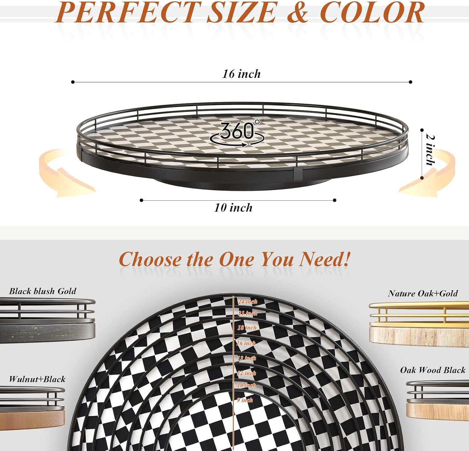 16" Black and White Kitchen Lazy Susan Turntable, Round Checkered Decorative Tray, Large Lazy Susan for Dining Table Centerpiece, Pantry, Kitchen, Bathroom, Countertop, Cupboard, Home Decor