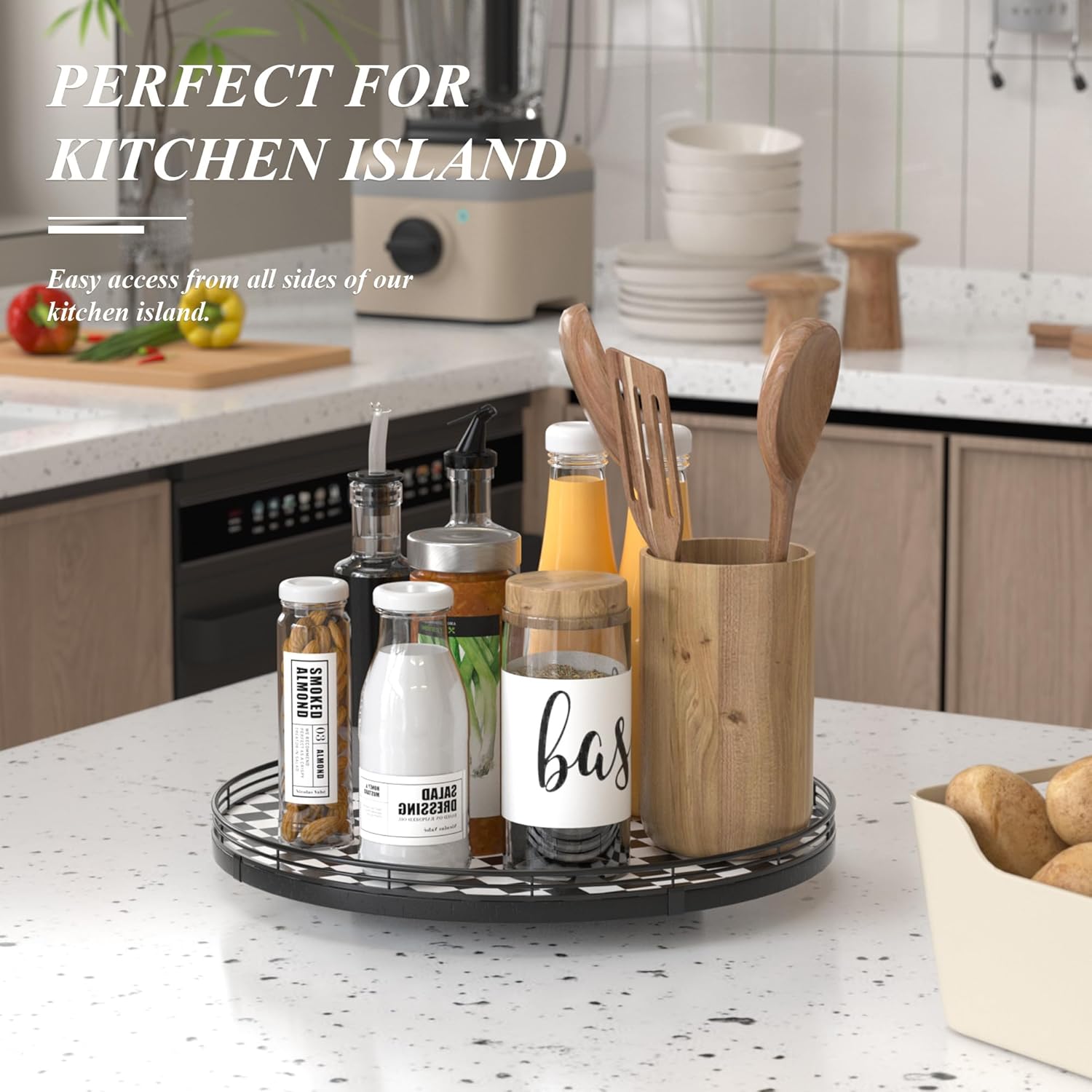 - CLASSIC BLACK AND WHITE CHECKERED DESIGN: A stylish black and white kitchen decoration plate with a sturdy iron frame, seamlessly blending with your black and white kitchen things to elevate your home decor. Perfect as a large decorative lazy Susan, a kitchen table centerpiece, or a table kitchen caddy, bringing both function and charm to your tabletop.