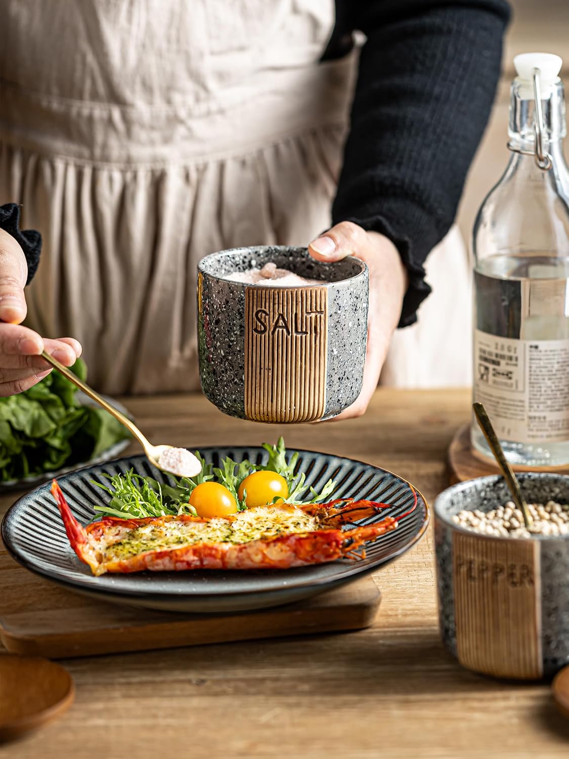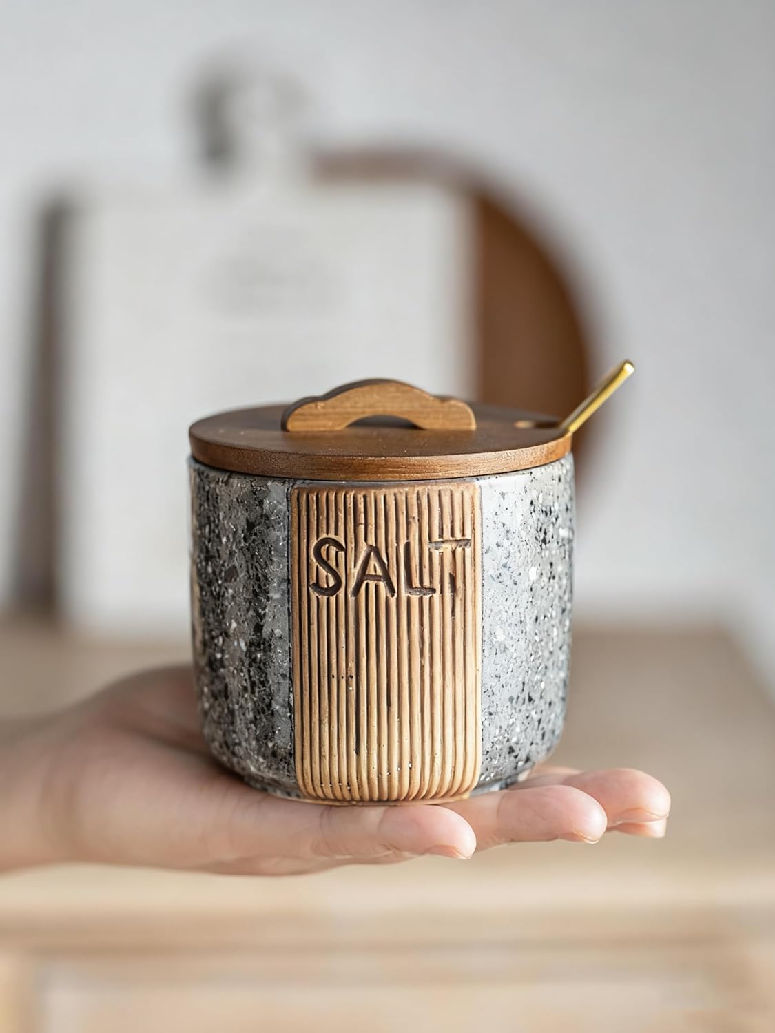 - Enhance your kitchen with this stylish salt container made of high-quality ceramic, featuring a woodgrain embossed design that mimics the look of wood. This salt containers for countertop combines rustic charm with sturdy ceramic, making it a perfect addition to your countertop