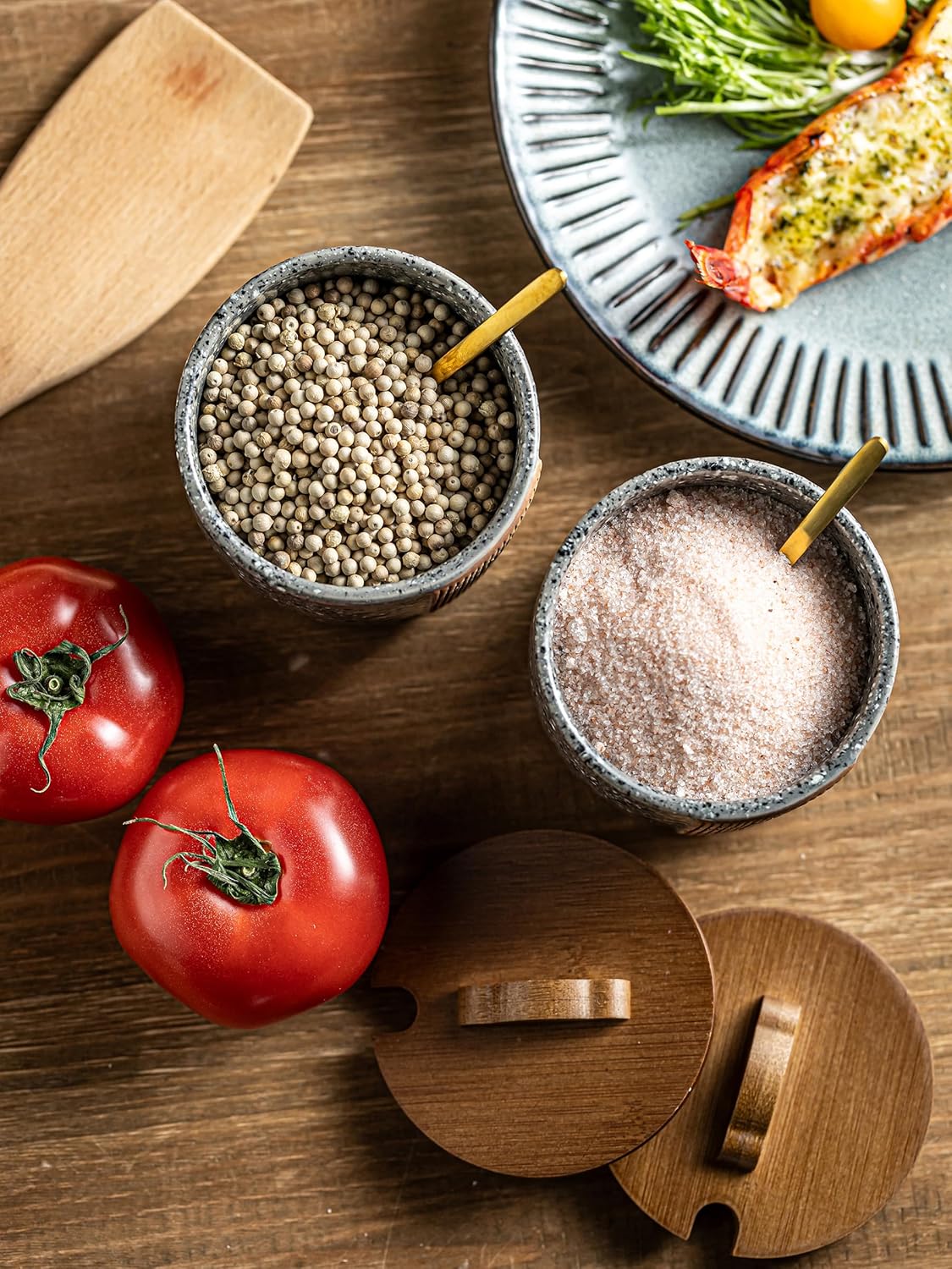 - This salt holder set includes a sleek wooden lid to keep your seasonings fresh and dry, along with a metal spoons for easy and precise dispensing. A perfect combination of style and functionality for your kitchen