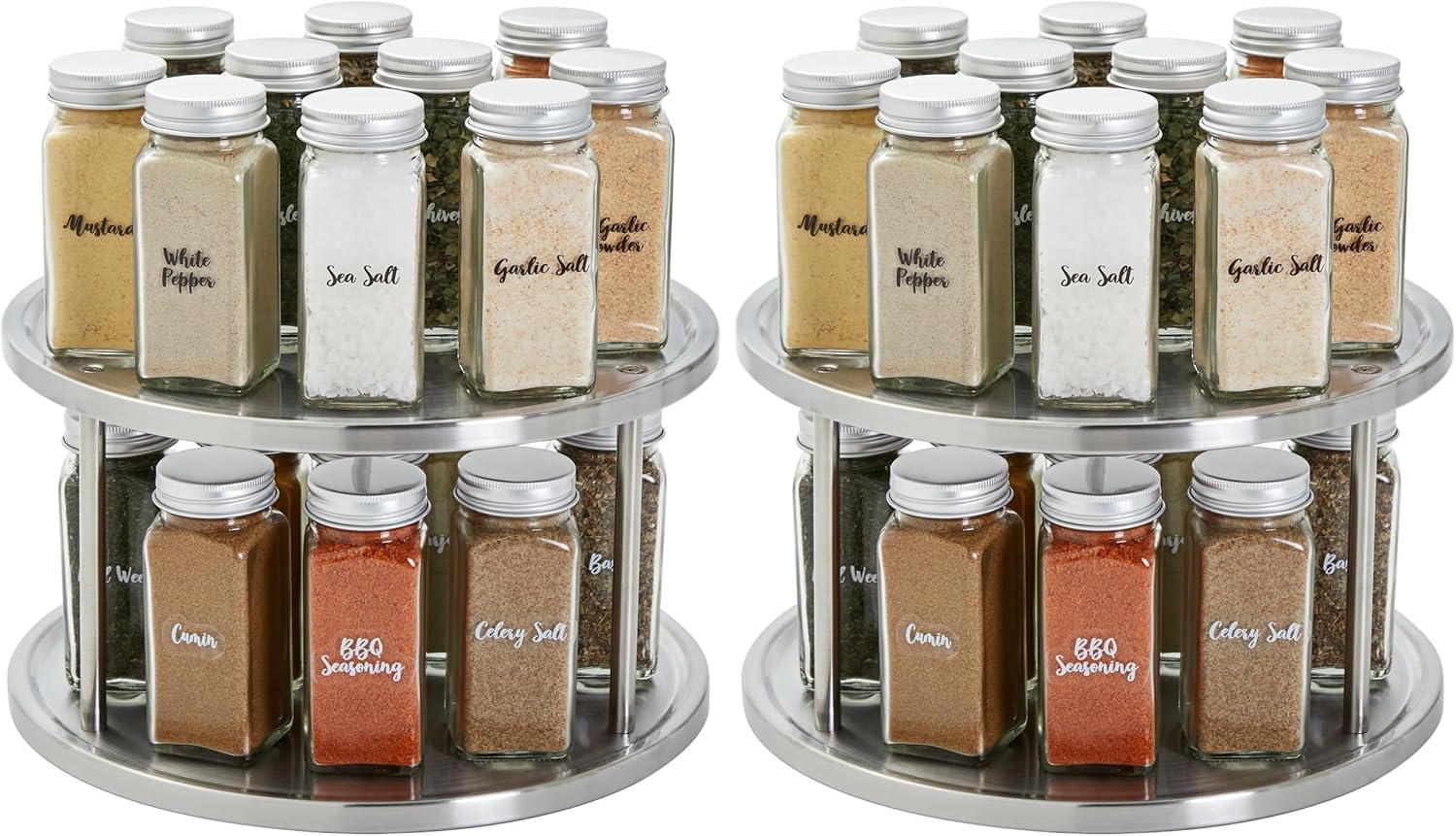 - Stainless Steel Design: The Juvale 2-Tier Lazy Susan Spice Rack Organizer provides a sophisticated solution for effective spice organization for cabinet use. Its polished stainless steel construction adds elegance to any kitchen counter organizer